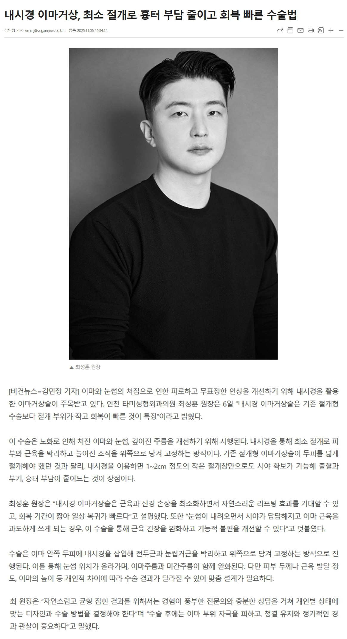 [ 의료칼럼 ] 내시경 이마거상, 최소 절개로 흉터 부담 줄이고 회복 빠른 수술법_최성훈 성형외과 전문의
