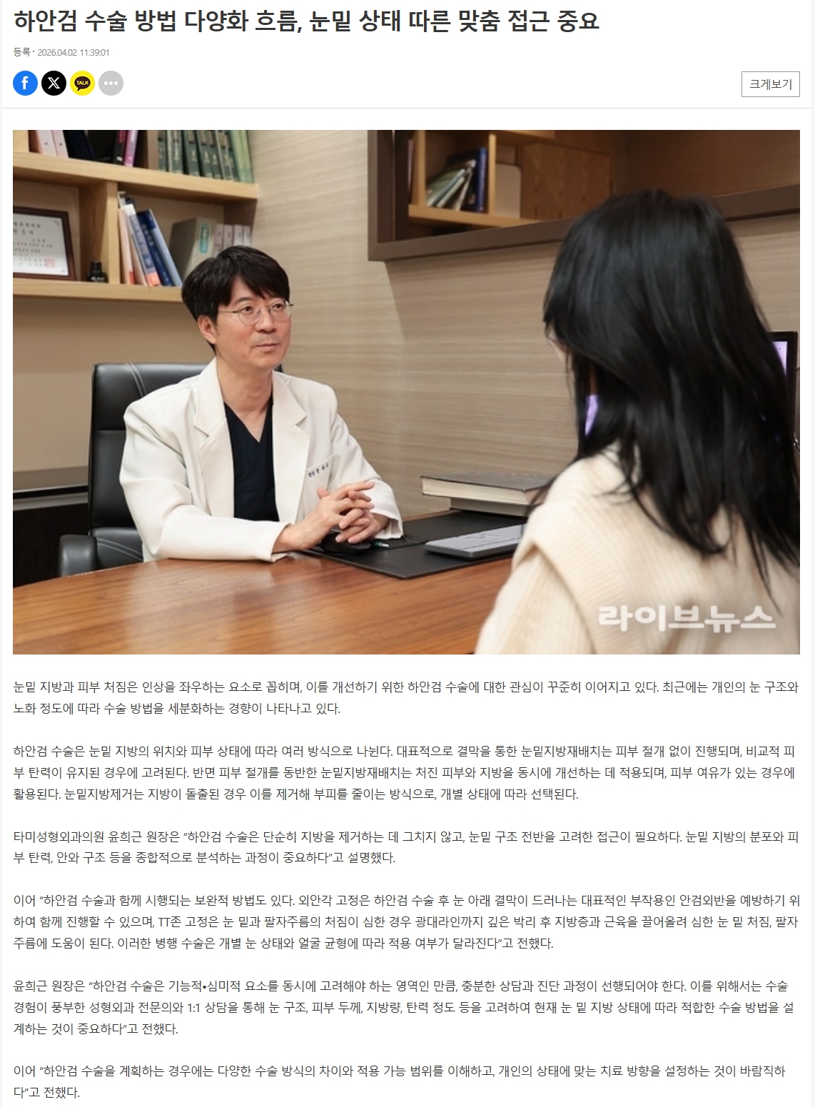 | [ 의료 칼럼 ] 하안검 수술 방법 다양화 흐름, 눈밑 상태 따른 맞춤 접근 중요 _윤희근 성형외과 전문 |